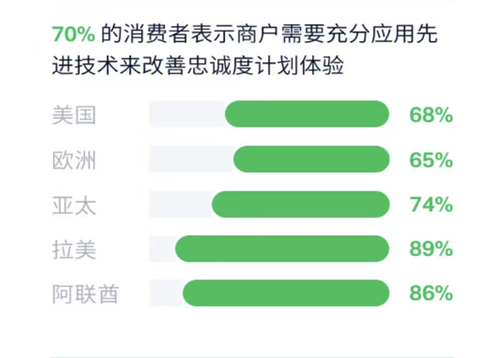 面临海量的电商途径,会员忠诚度方案大大有利于促进顾客复购行为。本次《白皮书》调研就发现,全球64%的顾客认为商户的“忠诚度方案”有待提高。此外,还有约70%的顾客表明商户需求使用先进科技来迭代自家“会员方案”。一起,不管是线上购物仍是线下消费,作为回头客的顾客会等待品牌可以记住他们的购买偏好,并给予他们作为忠诚顾客的回馈。
