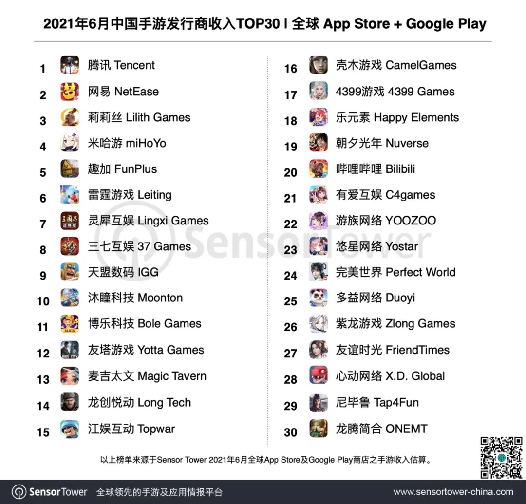 我国手游发行商收入 Top 30