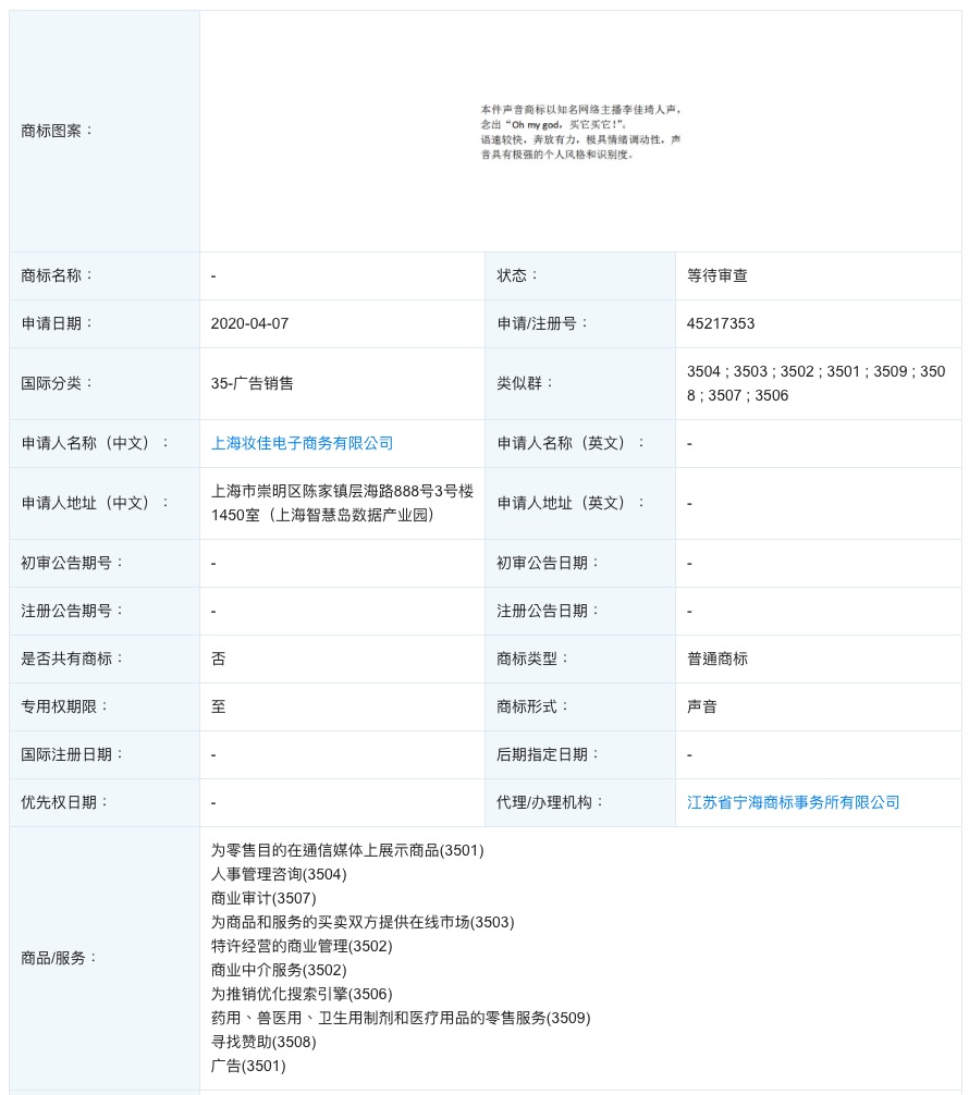 数据显现,4月7日,上海妆佳电子商务有限公司现已请求注册声响商标“Oh my god,买它买它!”,现在状况为等候检查。声响商标详细描绘为“本件声响商标以闻名网络主播李佳琦人声,念出‘Oh my god,买它买它!’。语速较快,豪放有力,极具心情调集性,声响具有极强的个人风格和辨认度。”