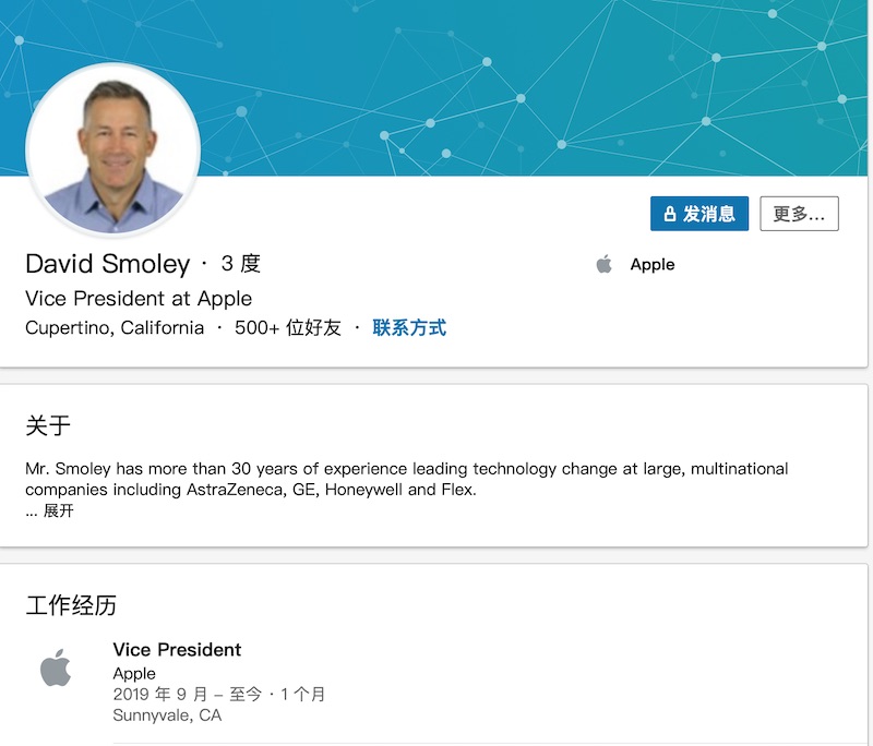 苹果近来承认,公司已延聘制药巨子阿斯利康(AstraZeneca Plc)首席信息官(CIO)David Smoley 担任副总裁一职。